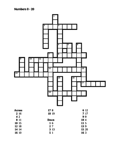 Numbers In English 0 To 20 Crossword Teaching Resources